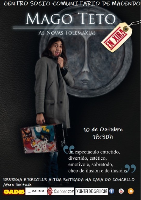 Sábado 10 de octubre, a las 18:30 horas en el centro Socio comunitario de Macendo, actuación del Mago Teto. Reserva y recoge tu entrada en la casa del ayuntamiento llamando al 988.493.000 (aforo limitado).