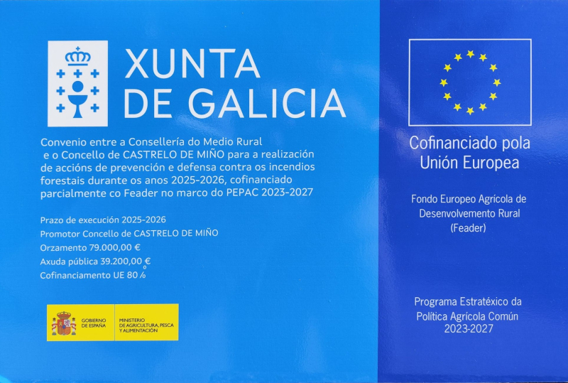 Con fecha de hoy, 1 de julio de 2025, se inician los trabajos de desbroce mecanizado conforme al CONVENIO ENTRE LA CONSELLERÍA DE MEDIO RURAL Y LA ENTIDAD LOCAL, AYUNTAMIENTO DE CASTRELO DE MIÑO, PARA LA REALIZACIÓN DE ACCIONES DE PREVENCIÓN Y DEFENSA CONTRA LOS INCENDIOS FORESTALES DURANTE LOS AÑOS 2025-2026, COFINANCIADO PARCIALMENTE CON El FONDO EUROPEO AGRÍCOLA DE DESARROLLO RURAL (FEADER) NO MARCO DEL PLAN ESTRATÉGICO DE La POLÍTICA AGRARIA COMÚN (PEPAC) 2023-2027.