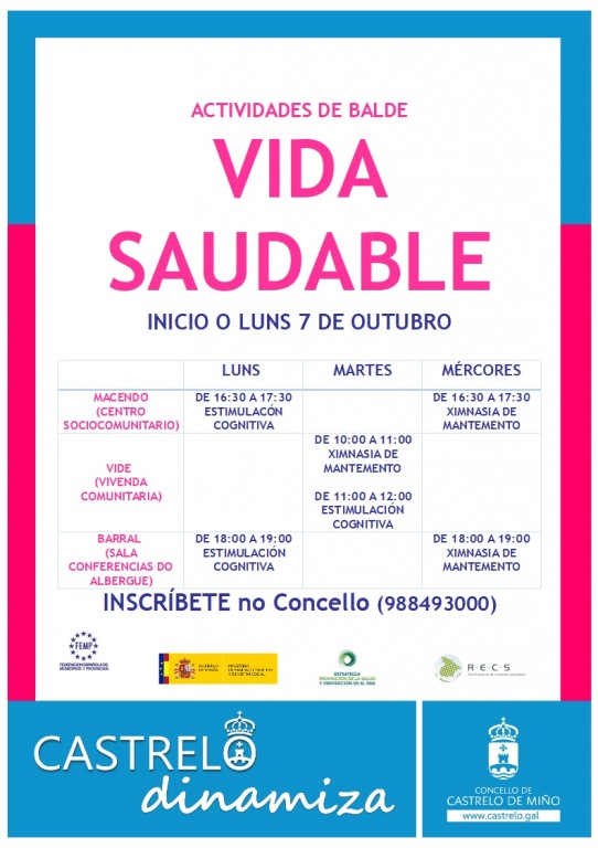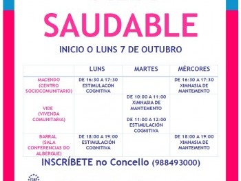 VIDA SAUDABLE. Dará comezo o día 7 de outubro nos lugares de Macendo (Centro Sociocomunitario), Vide (Vivenda Comunitaria) e Barral (Sala de Conferencias do Albergue). Inscríbete no concello (988/493000).